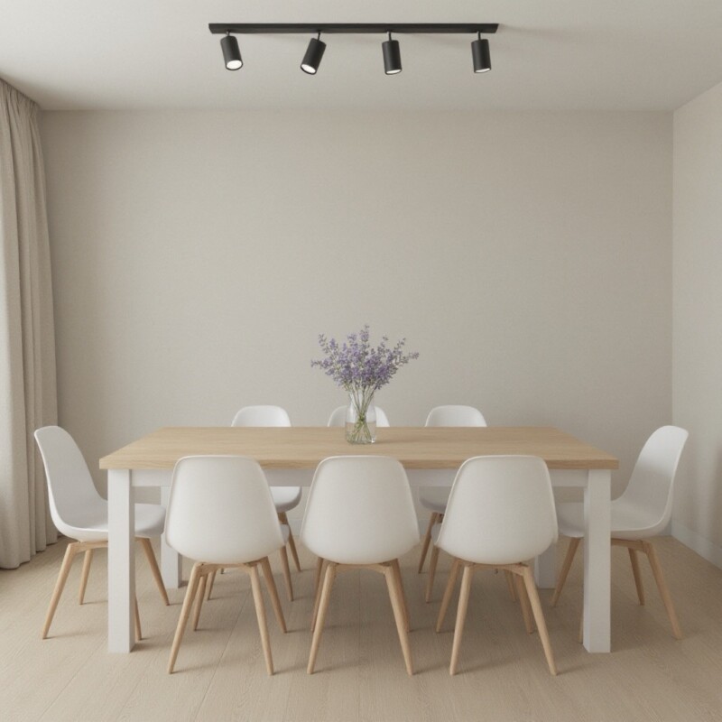 El aplique F1 de 4 luces es una solución versátil y contemporánea para iluminación técnica en interiores. Puede instalarse tanto en techo como en pared, ideal para pasillos, livings, escritorios, cocinas o galerías.