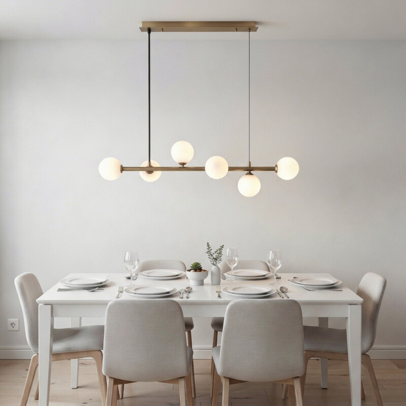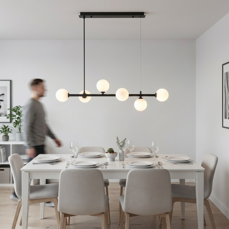 Una lámpara de colgar de desarrollo lineal, pensada para organizar la luz en espacios centrales como mesas de comedor, islas o barras. Su diseño limpio y equilibrado permite una distribución uniforme, acompañando la arquitectura sin sobrecargar el ambiente.
