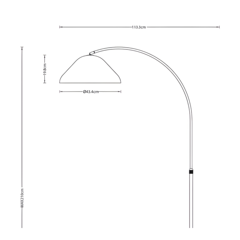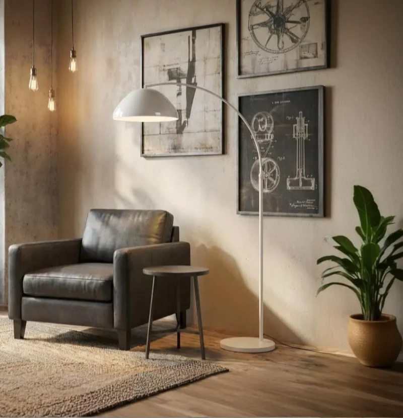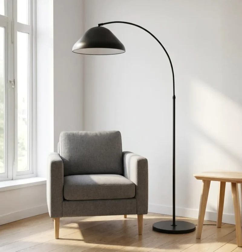Una lámpara de pie definida por un trazo curvo y continuo que proyecta la luz exactamente donde la necesitás. Su diseño permite llevar el punto de iluminación sobre mesas, sillones o áreas de lectura sin ocupar superficie de apoyo.