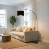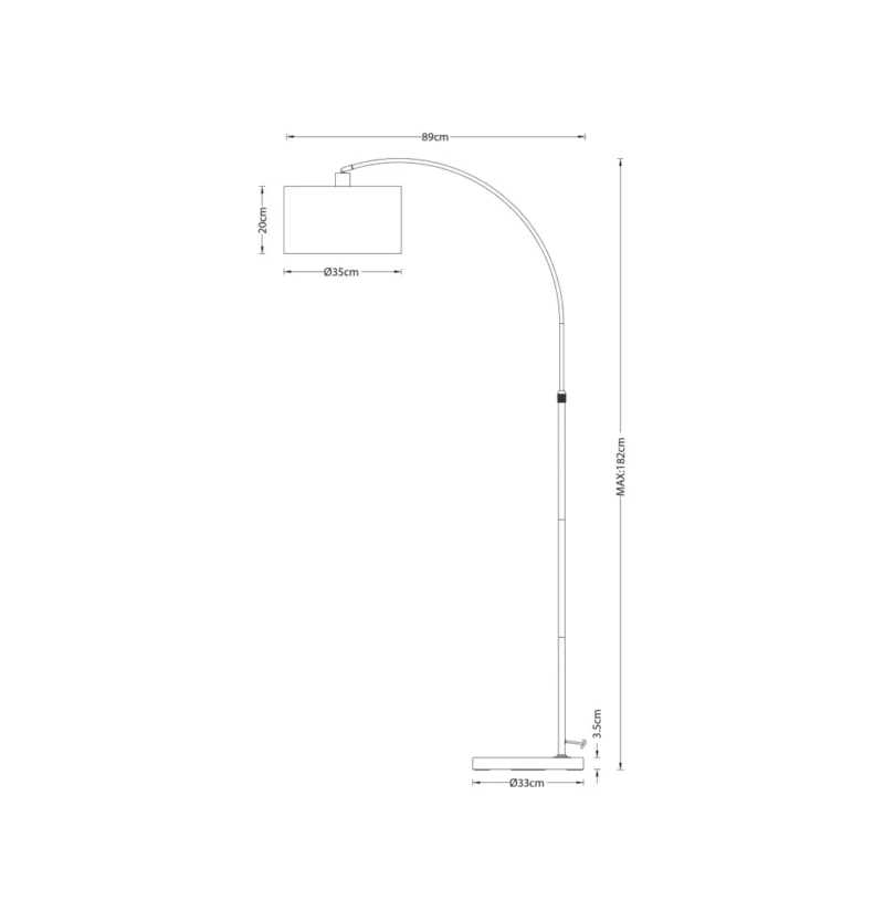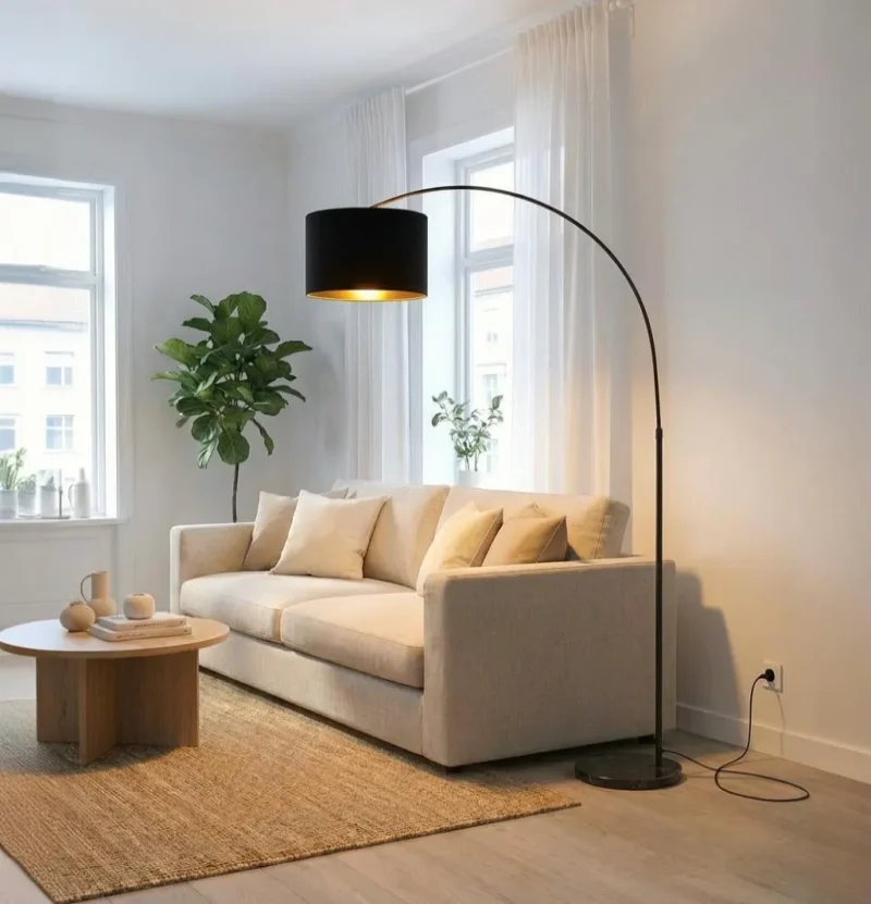 Un arco sutil que se proyecta en el espacio con elegancia y precisión. Su estructura esbelta permite llevar la luz hacia el centro del ambiente sin necesidad de puntos en el techo, logrando una iluminación amplia, cálida y envolvente.