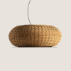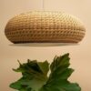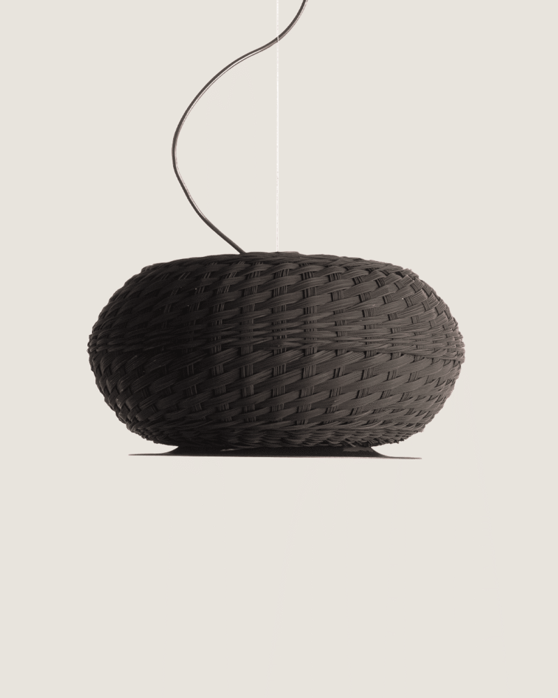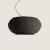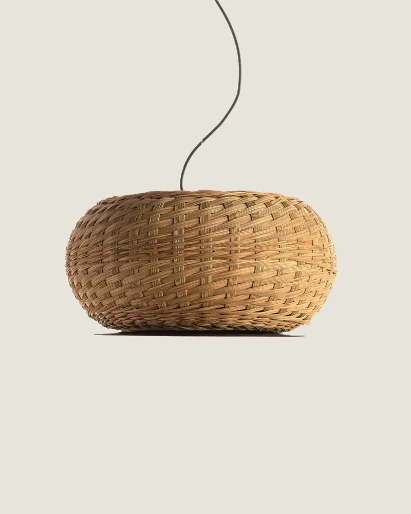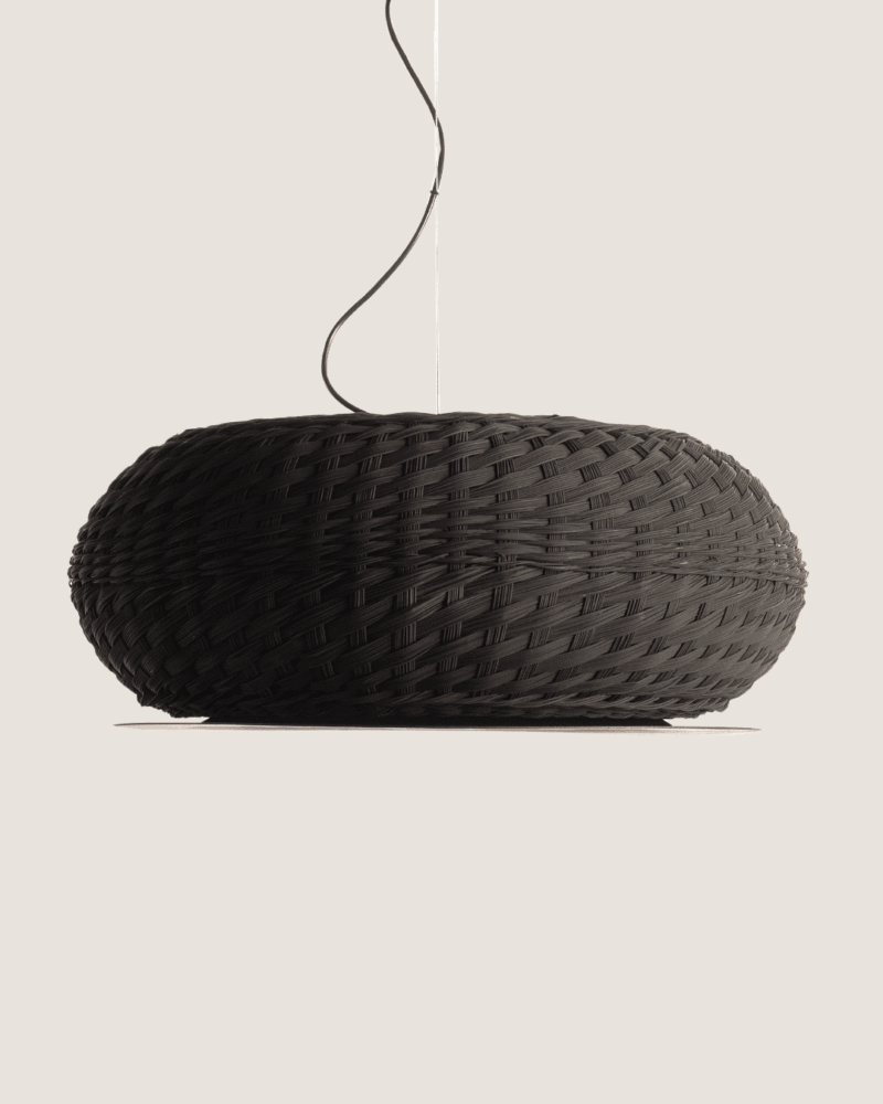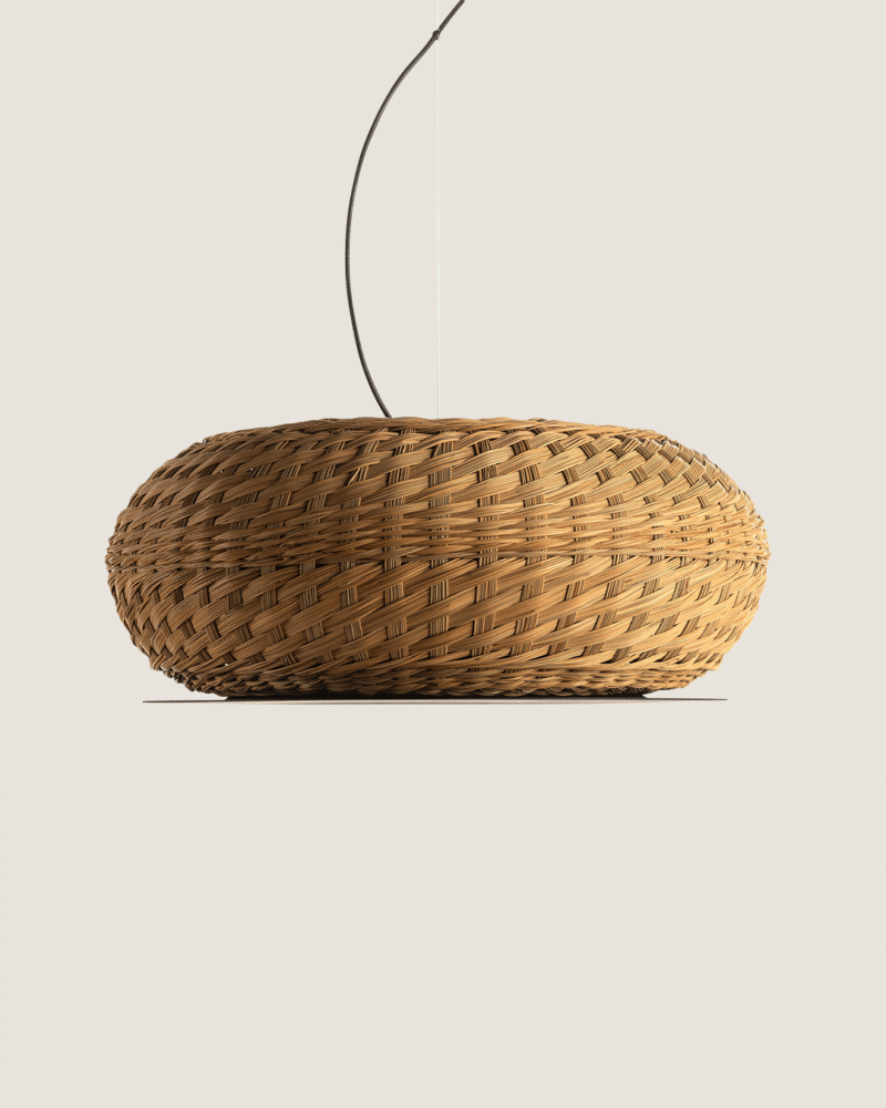 Lámpara de suspensión de luz semi directa. Cuerpo en tejido de fibra natural “simbol” hecho a mano y disco de aluminio. Tensores de acero galvanizado y cable blanco o negro.