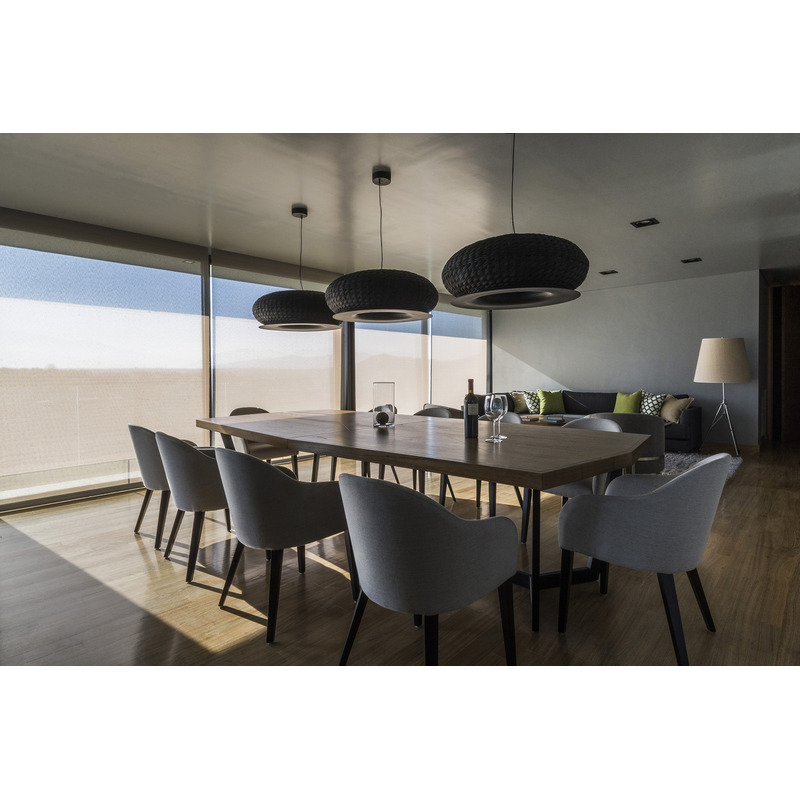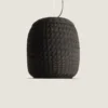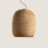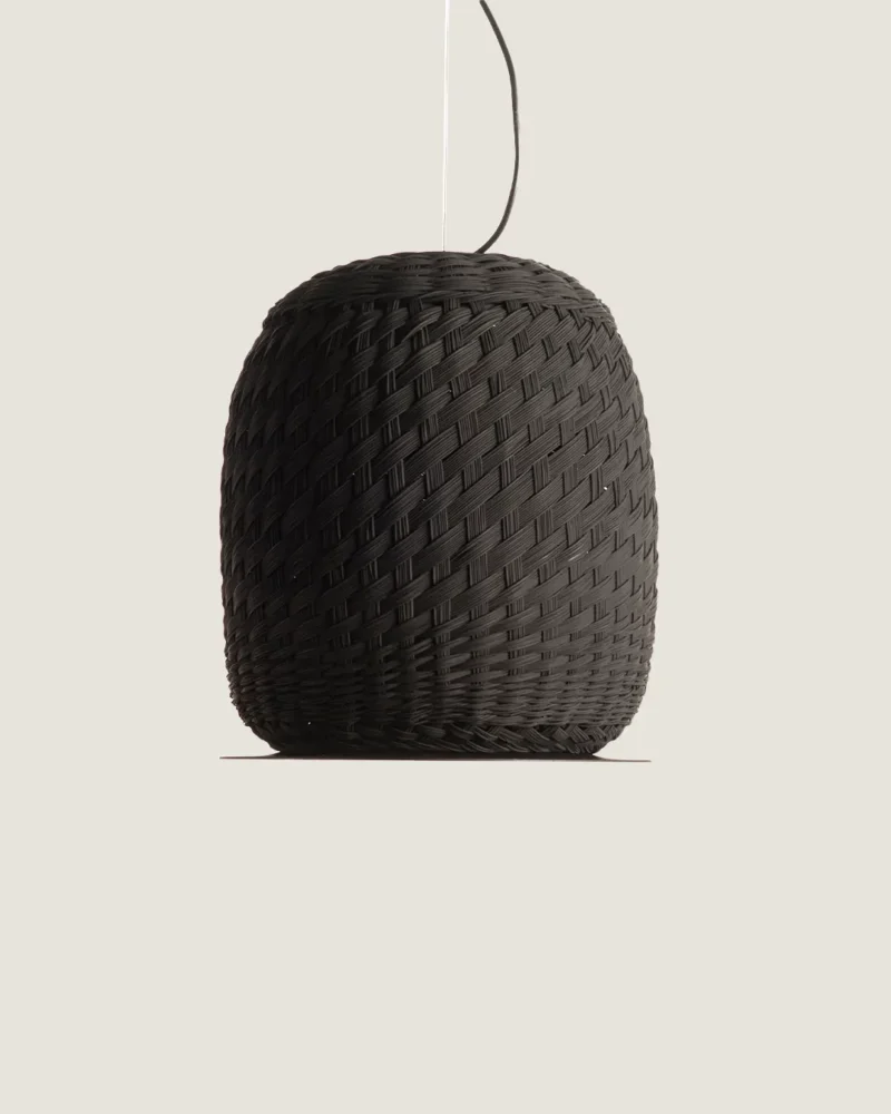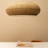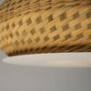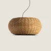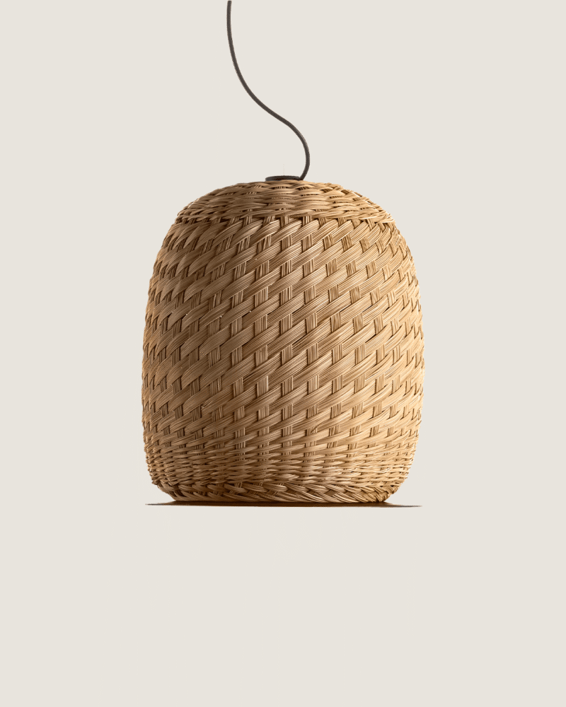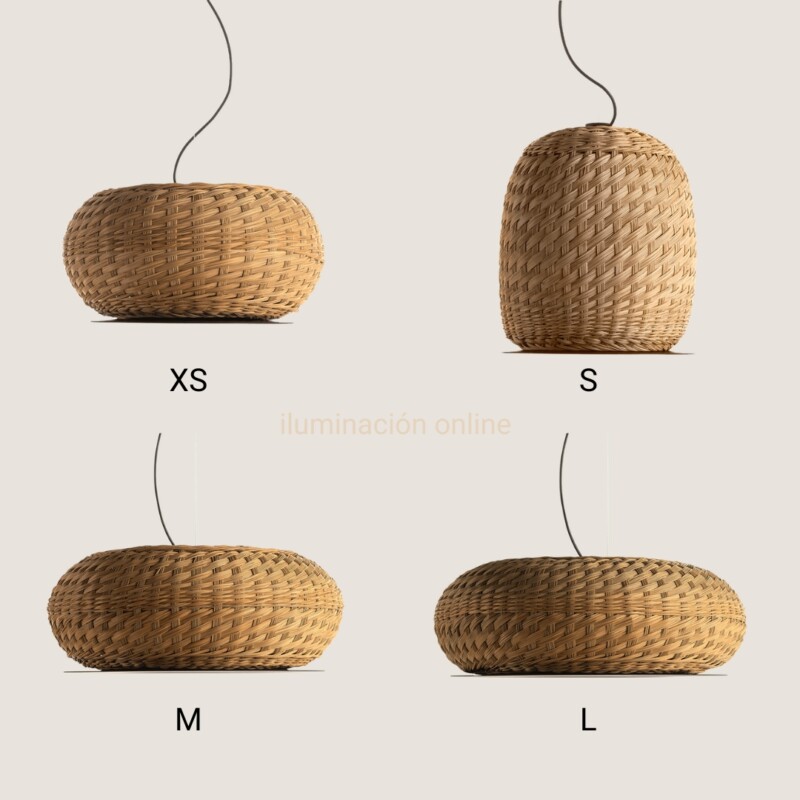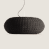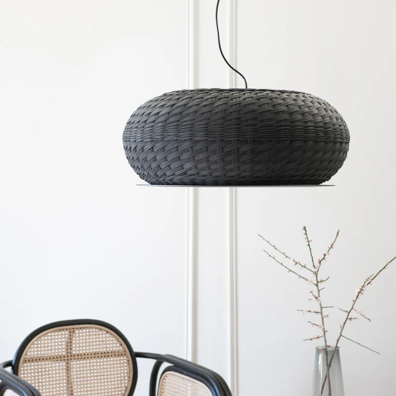Lámpara de suspensión de luz semi directa. Cuerpo en tejido de fibra natural “simbol” hecho a mano y disco de aluminio. Tensores de acero galvanizado y cable blanco o negro.